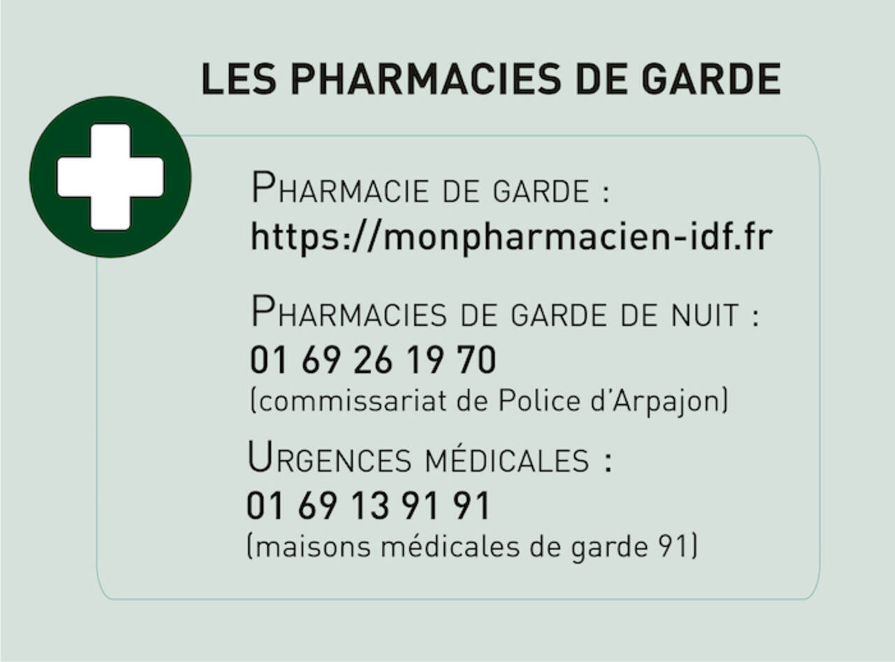Pour connaître les pharmacies de garde de nuit, vous pouvez contacter le commissariat de Police d’Arpajon :