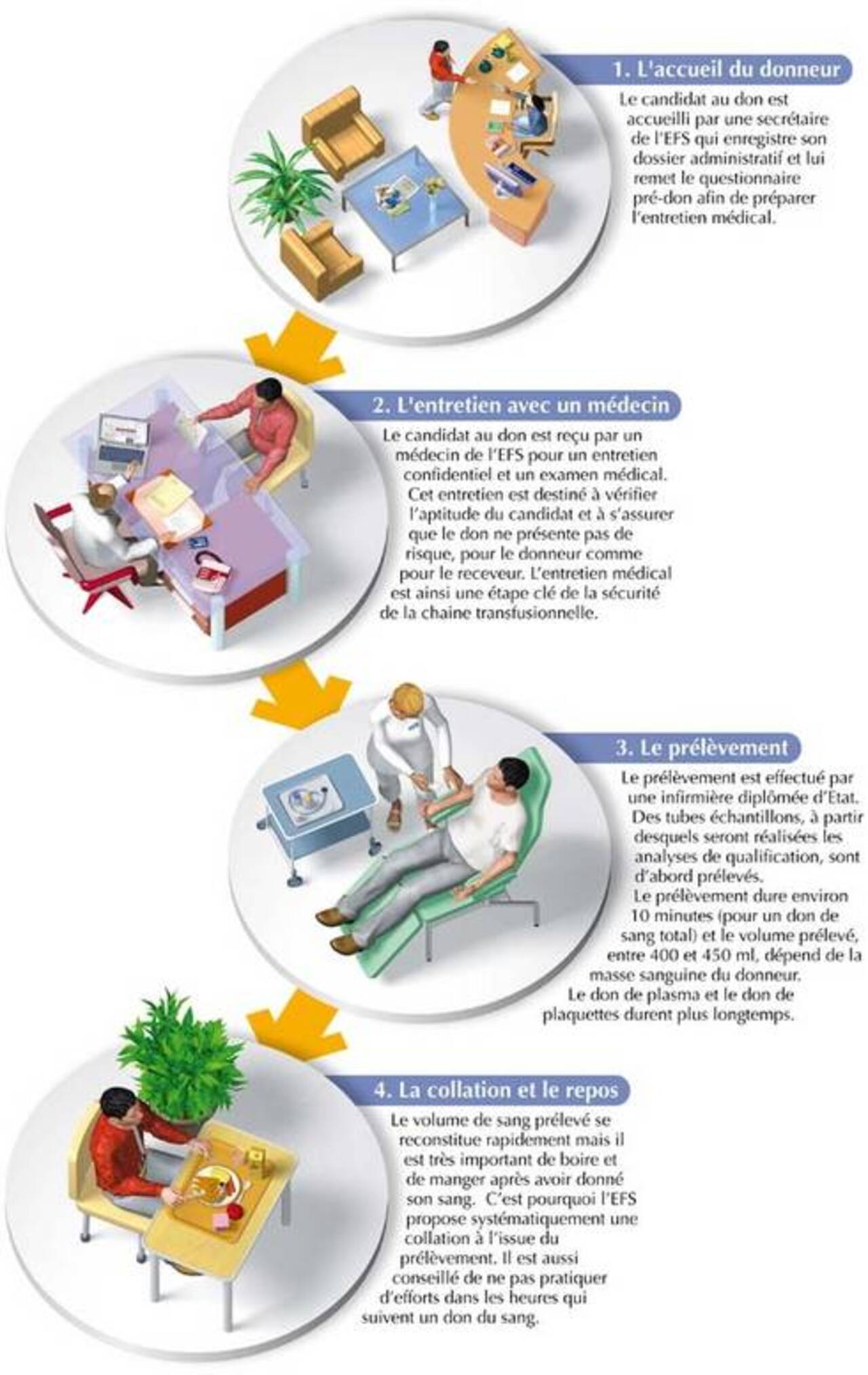 C’est le don le plus courant. On prélève entre 400 ml et 500 ml de sang suivant la taille et le poids du donneur. Le sang sera ensuite trié pour séparer les globules rouges, le plasma et les plaquettes.