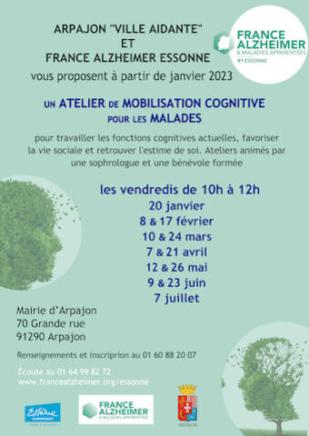 Renseignements et inscriptions au 01 60 88 20 07. Écoute au 01 64 99 82 72. www.francealzheimer.org/essonne