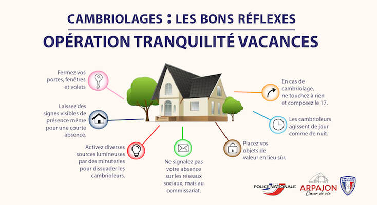 - avant votre départ, fermer correctement fenêtres et volets. Vérifier le bon état de vos serrures et verrous. Il est important de "faire vivre" votre logement. Un voisin ou un ami peut utilement venir ouvrir et fermer les volets, allumer quelques lumières. À défaut, une prise de type "minuteur" peut permettre d’allumer certaines lampes sans présence dans votre logement