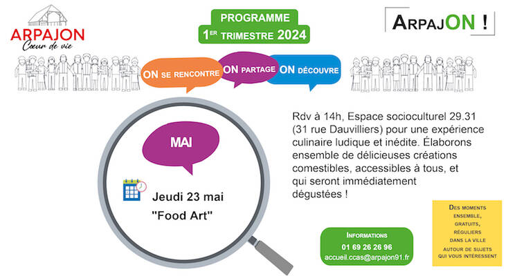Connaissez-vous le "Food Art" ? C'est l'art d'utiliser la nourriture pour créer des œuvres ! En clair, faire de jolis plats…artistiquement conçus … C'est cette expérience culinaire ludique et inédite que propose Arpaj'ON jeudi 23 mai. Il s'agira d'élaborer de délicieuses créations comestibles, accessibles à tous, et qui seront immédiatement dégustées ! Rendez-vous à 14h à l'Espace socioculturel (29 rue Dauvilliers).