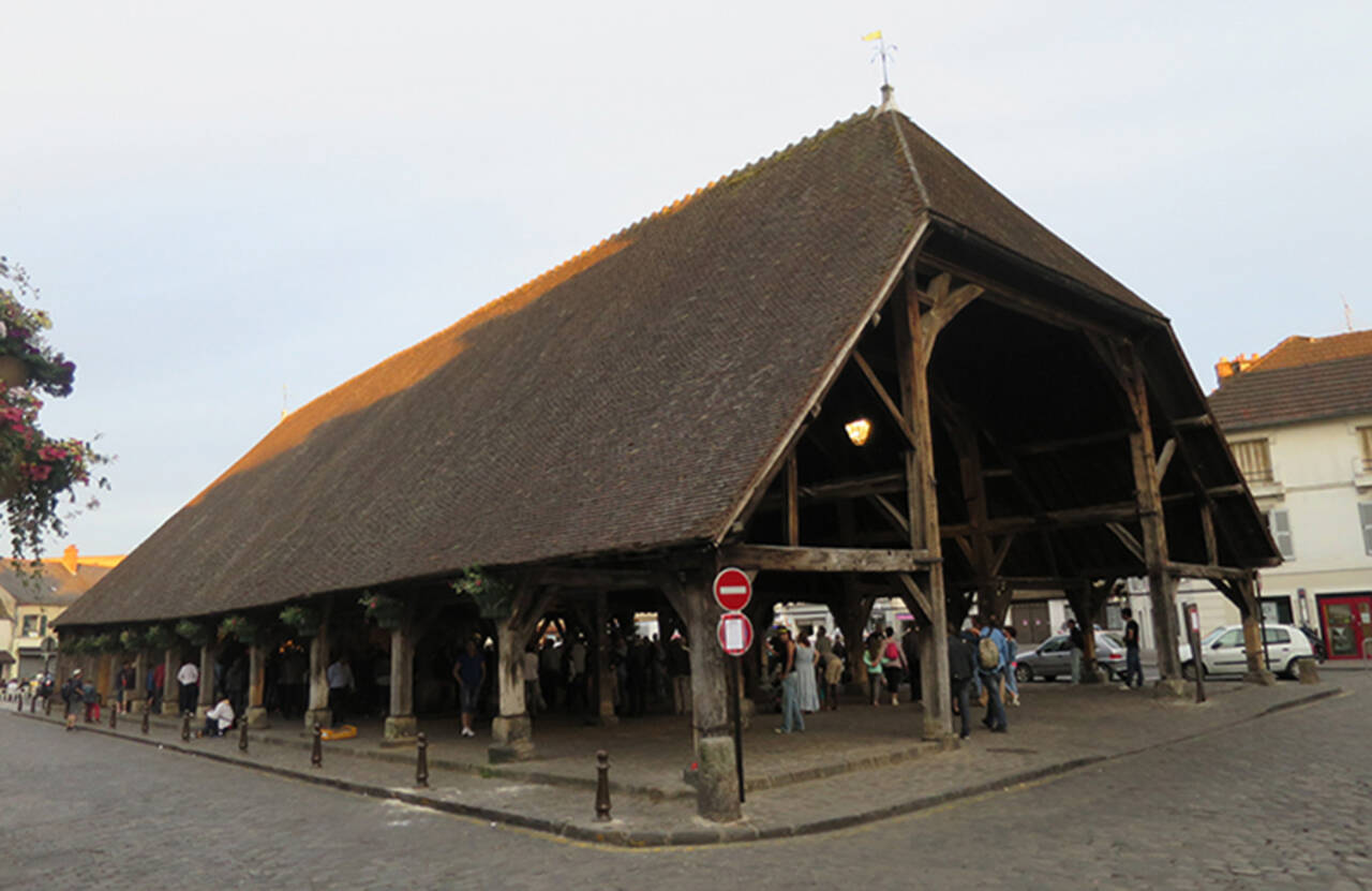 Au XVe siècle, un important marché se tient dans la ville. Vers 1470, l’amiral de Graville, seigneur de Chastres et de Marcoussis, fait construire cette halle pour abriter les étals. La toiture à deux pans comporte une demi-croupe aux deux extrémités. Elle est soutenue par quatre rangées de douze piliers en bois de chêne, dressés sur une assise de grés.